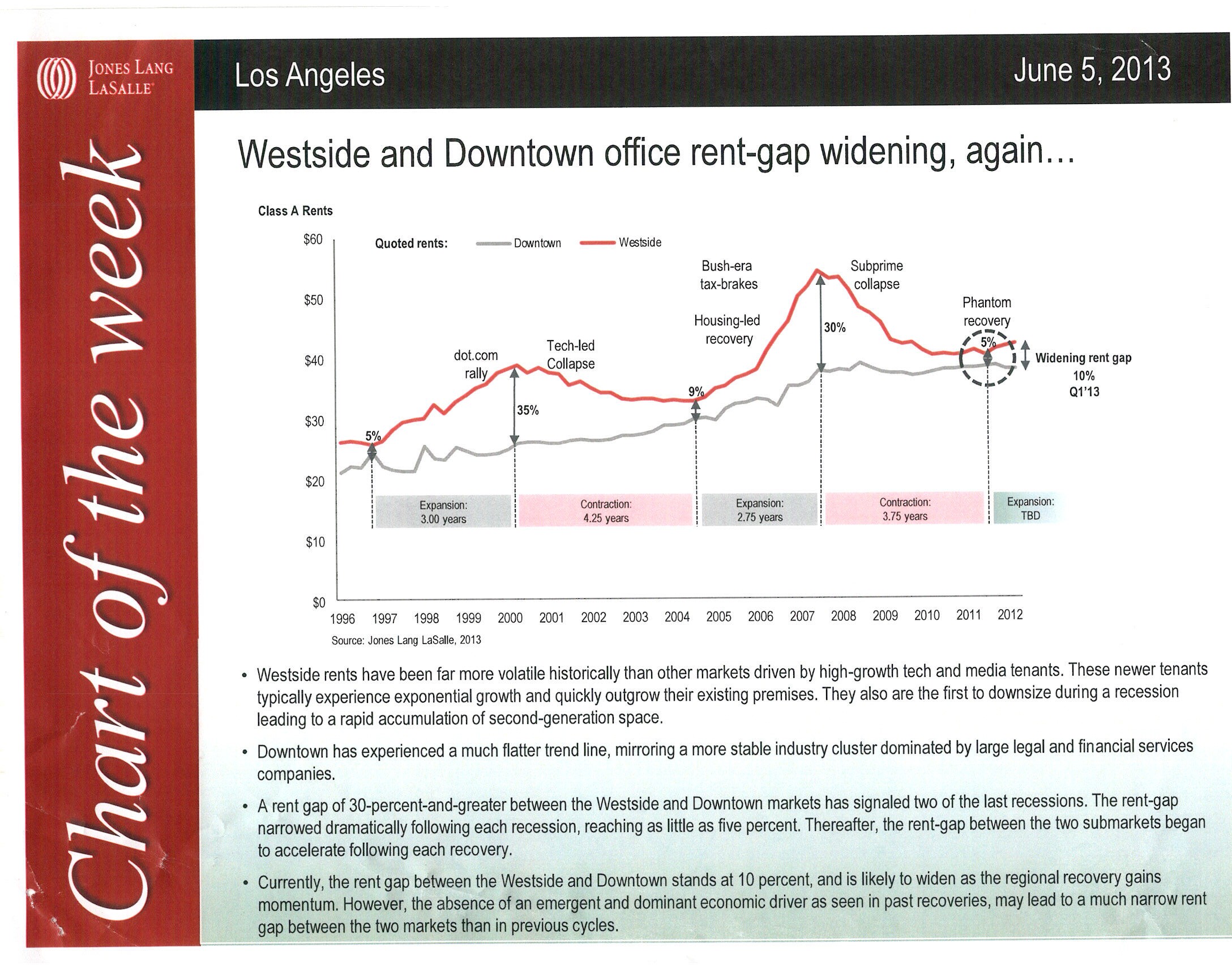 Jones Lang LaSalle shows that over the last 20 years, the Los Angeles Westside had much more volatile rents than Downtown Los Angeles. JLL claims that the Westside has startup tenants, while Downtown Los Angeles has more established tenants. The gap between the two widens in booms and narrows in busts. A 30% spread of Westside rents over Downtown rents predicts recession, according to JLL. You can enlarge the chart by clicking on it.