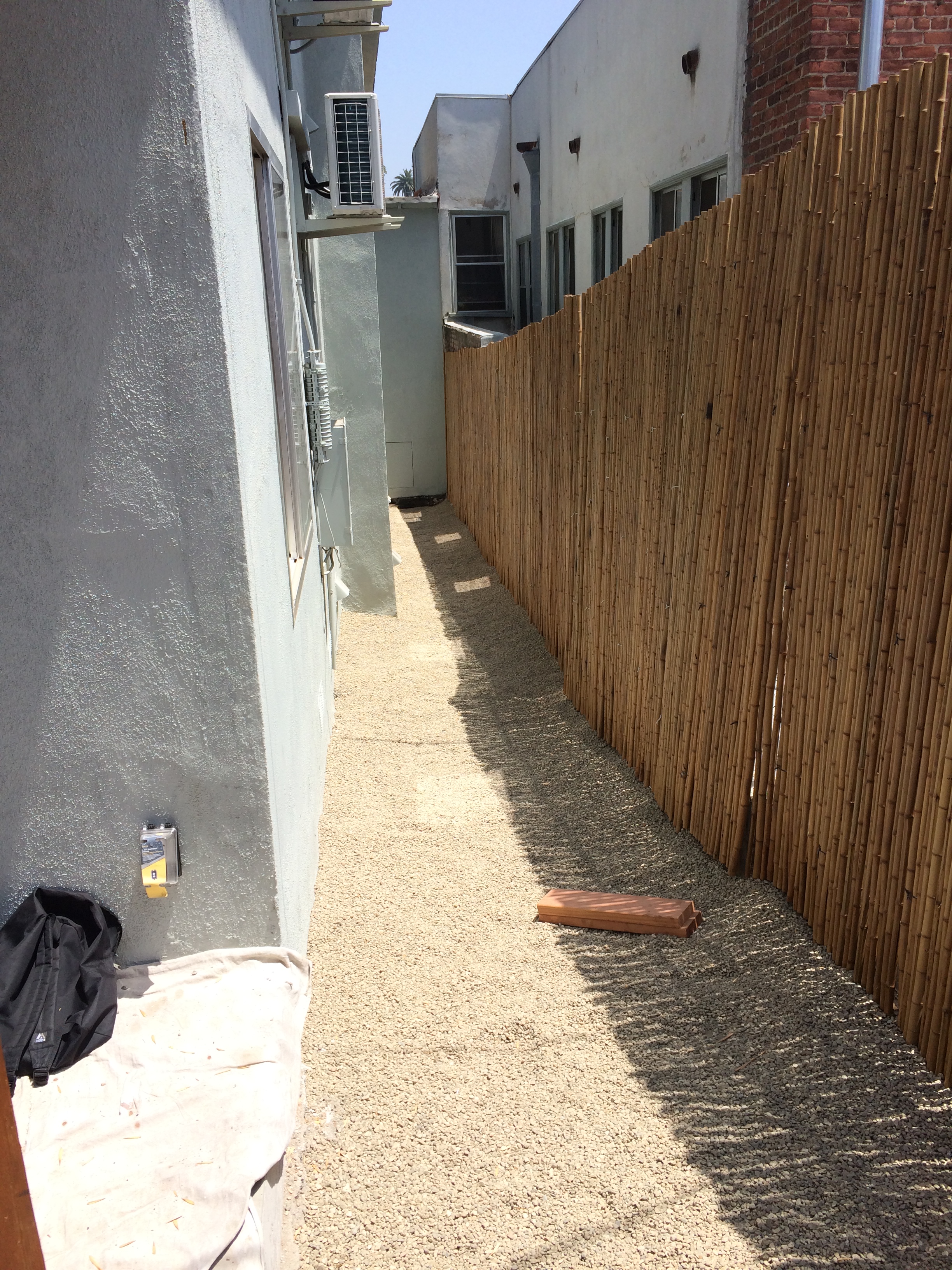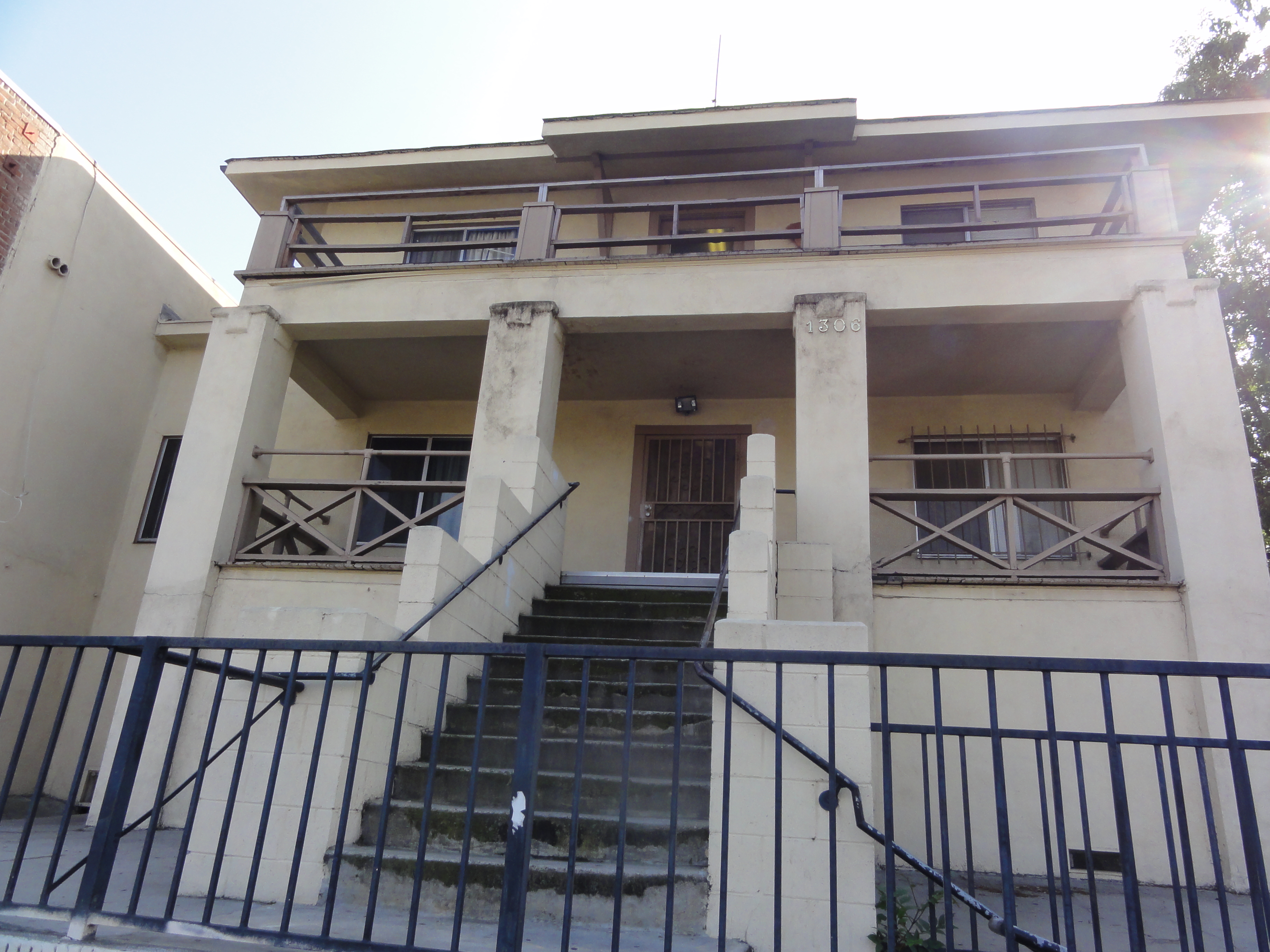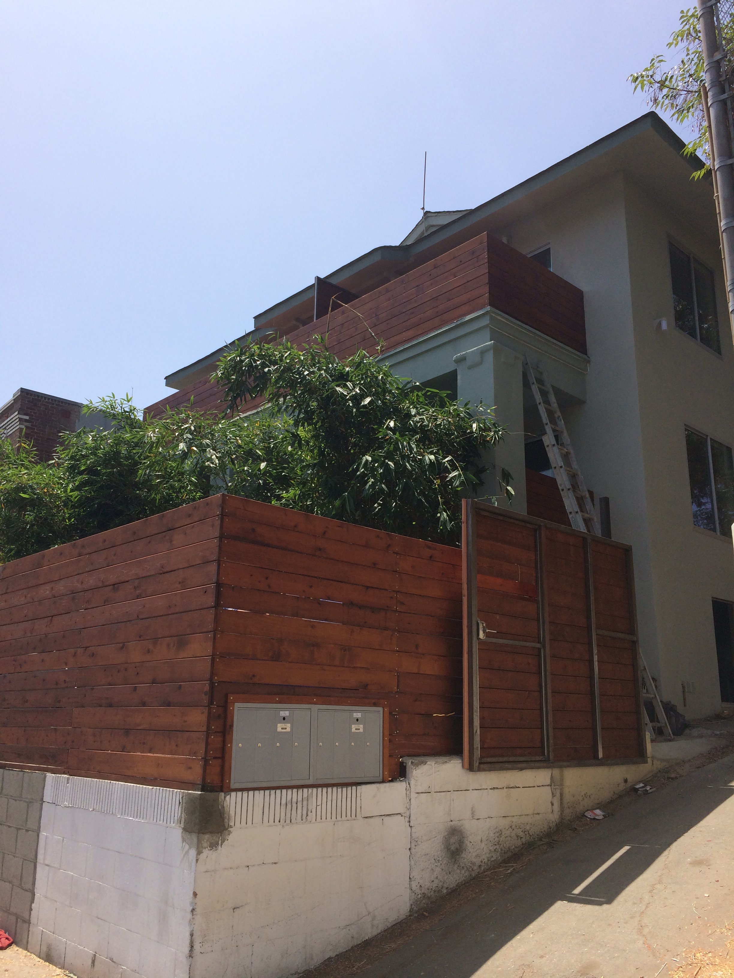 PMI renovated this 1911 Echo Park Craftsman apartment building at 1306 Temple Boulevard sandwiched between a grade school and a liquor store. The paint and rails detracted from the character of the building. The absence of landscaping and accessibility from the street gave a commercial image for this residential property. PMI retained most of the historical features but used paint, landscape, and wood fencing to create a more residential pallet. PMI used tall timber bamboo to soften the exterior and provide a transition from busy Temple Boulevard and the Hollywood Freeway. The vertical redwood fencing (the hipster fence) gives a contemporary feel and provides the security required by new residents in a gentrifying neighborhood. See renovated exterior below.