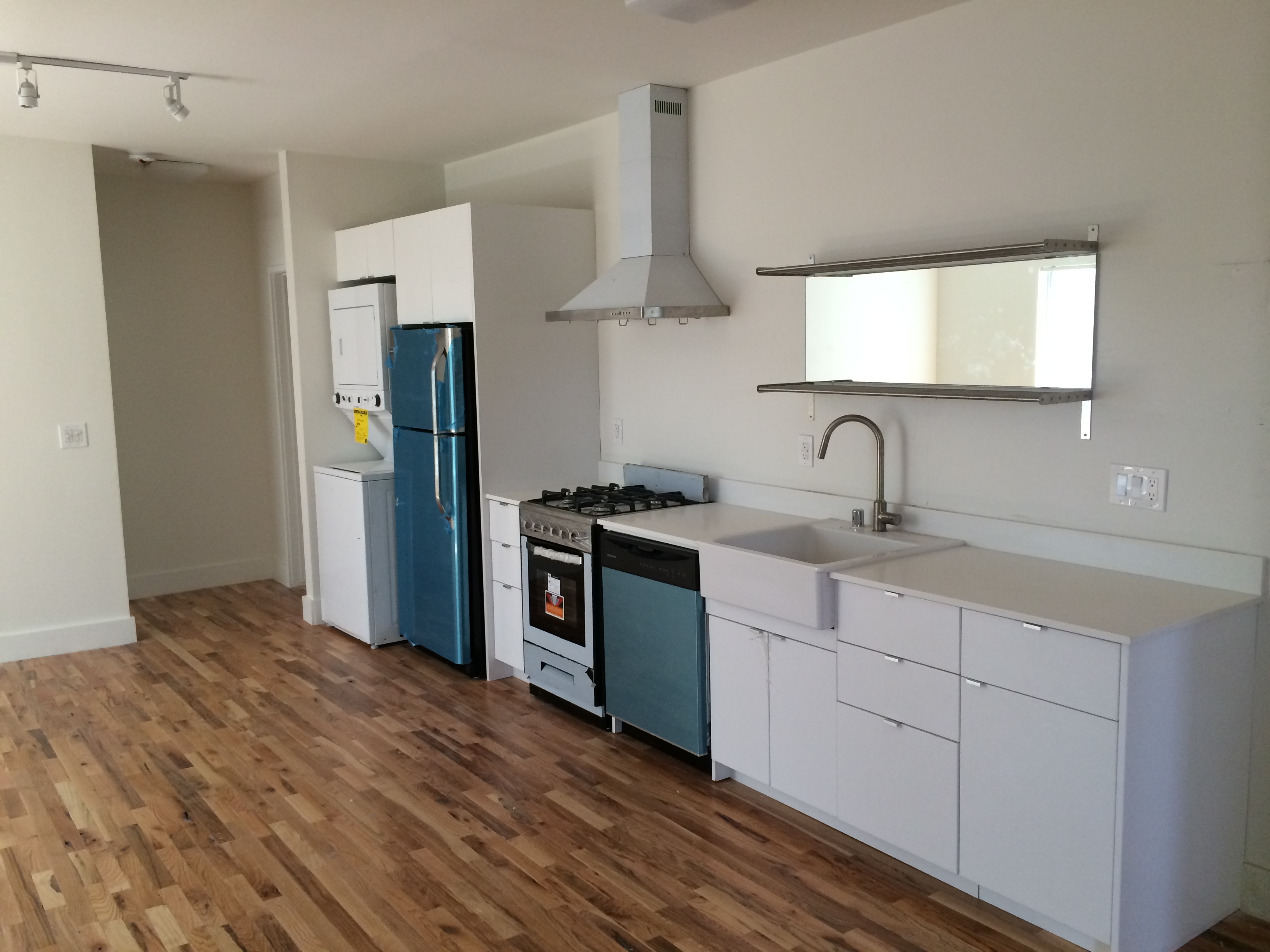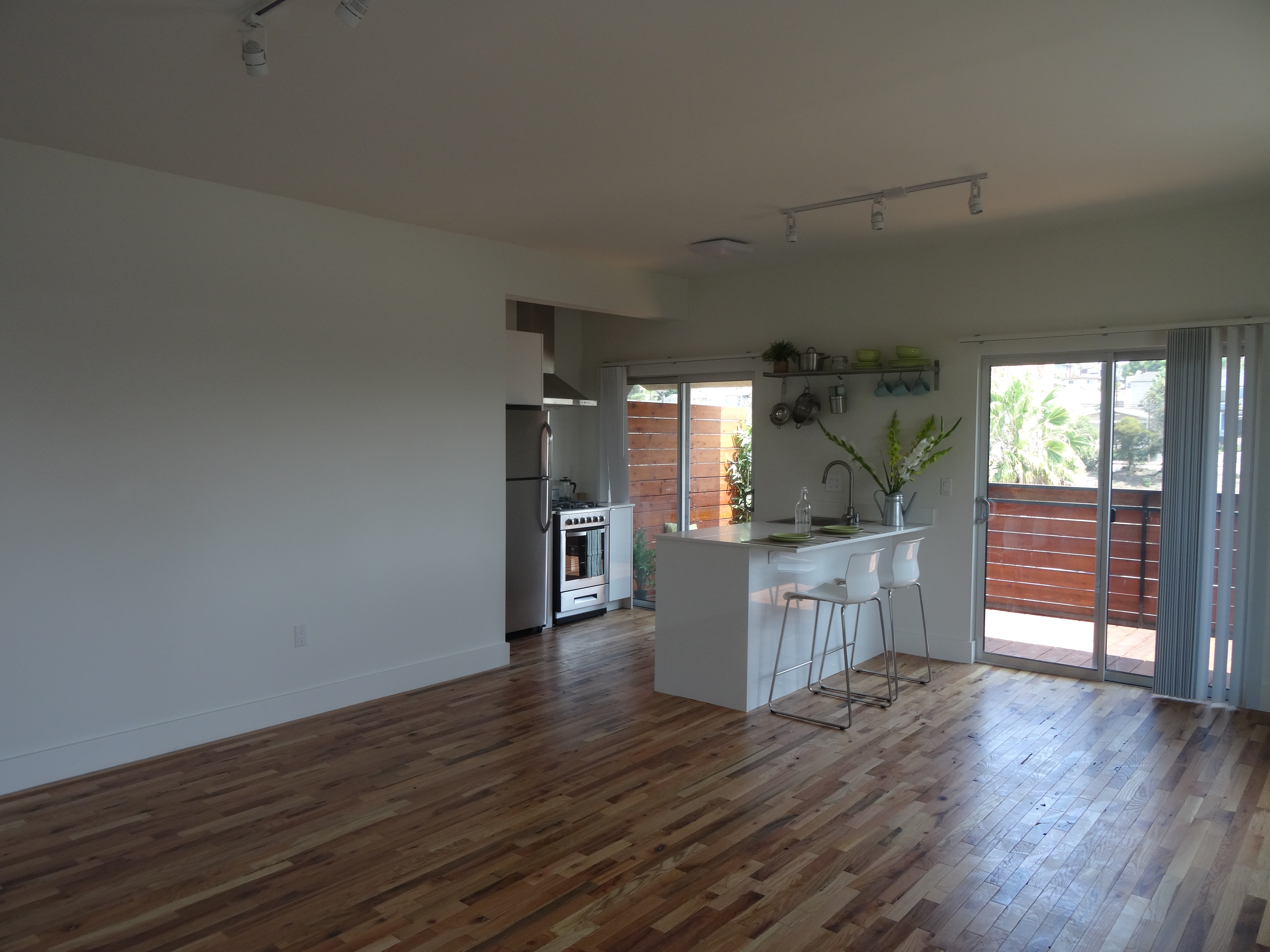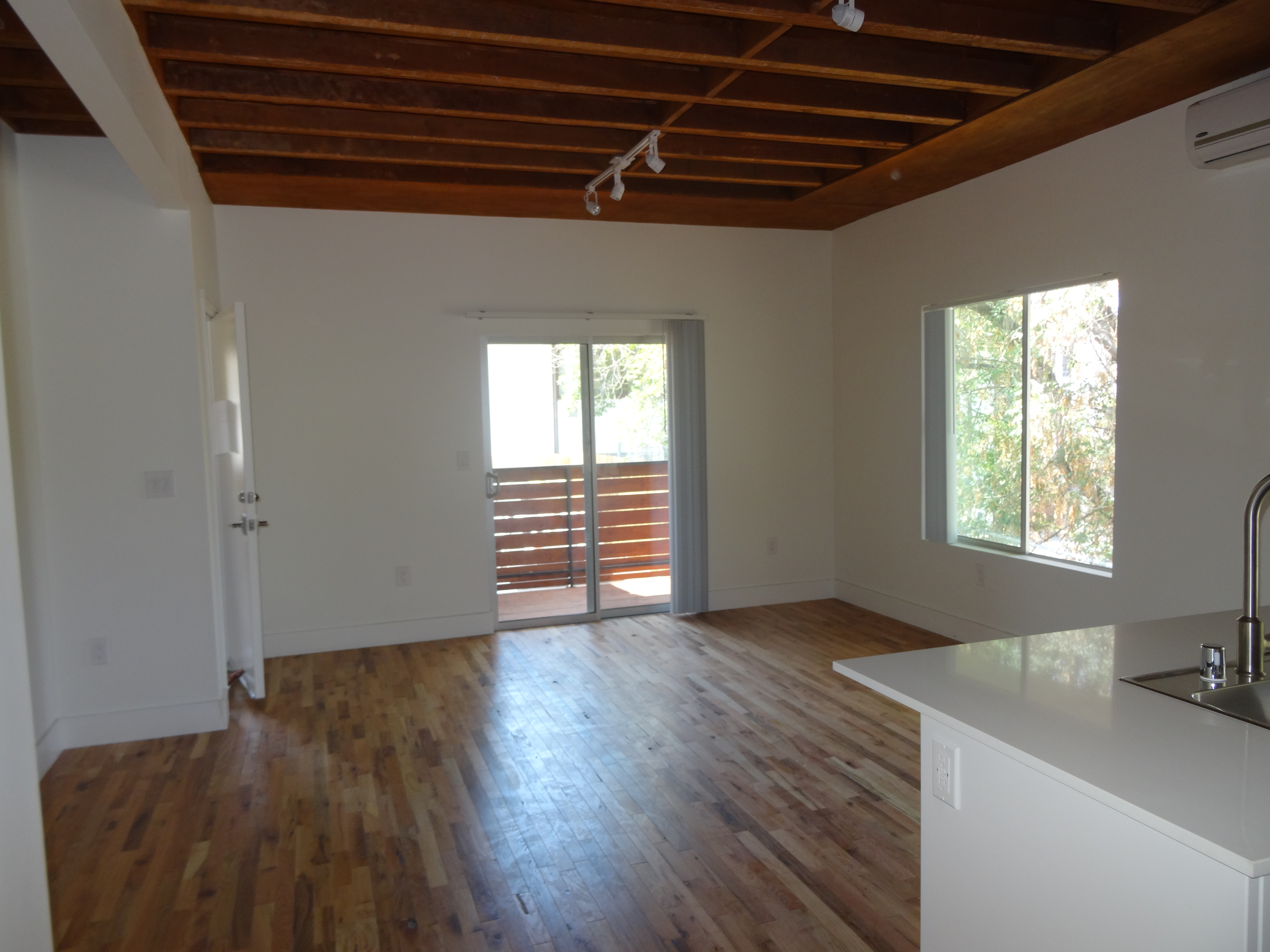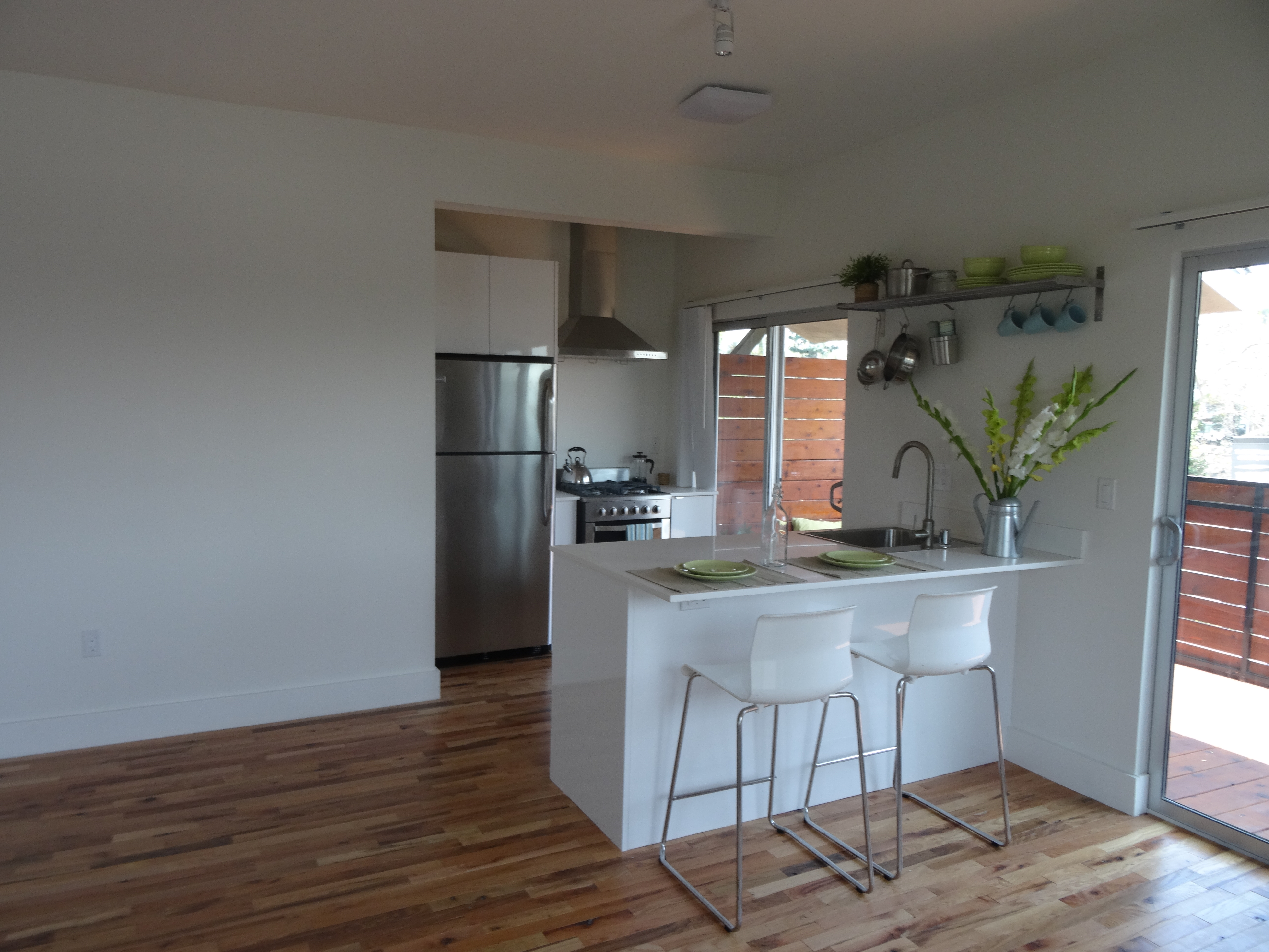 Without the corridor, the renovators expanded each one bedroom unit and combined the kitchen, dining, and living into one great room. Each unit had new drywall, paint, solid hardwood floors, and double pane windows. White paint and straight lines made each unit look larger. New large redwood sided balconies extended each unit into the outdoors. Contemporary fixtures and the open kitchens, especially in the unit with a doug fir exposed ceiling, gave the units a loft like look. See pictures below.