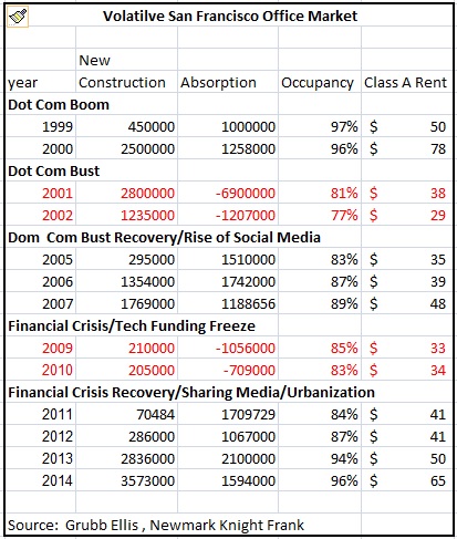 San Francisco has averaged absorption of approximately 400,000 square feet per year over the last 24 years and 627,000 square feet per year over the last ten years. During the dot com boom, absorption clocked in at 1 million square feet in 1999 and 1,258,000 square feet in 2000. Occupancies reached 97% in 1999, and class A rents reached $78 per square foot. Developers responded with 2.5 million square feet under construction in 2000 and 2.8 million square feet in 2001. However, in 2001 just as this supply was coming online, absorption declined to a -6.9 million square feet. The absorption declined again in 2002 by a negative1.2 million square feet. Occupancies declined to 77% in 2002 (over 40% vacancy in SOMA), and class A rents fell to $28 by 2003.